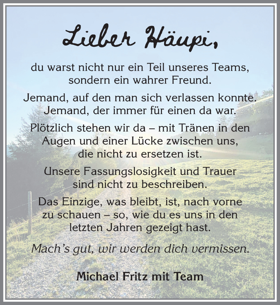 Hier finden Sie alle Traueranzeigen aus der Zeitung, die bisher für Adolf Häupi erschienen sind. Weitere Traueranzeigen, die in der Zeitung erscheinen, werden hier ebenfalls aufgelistet