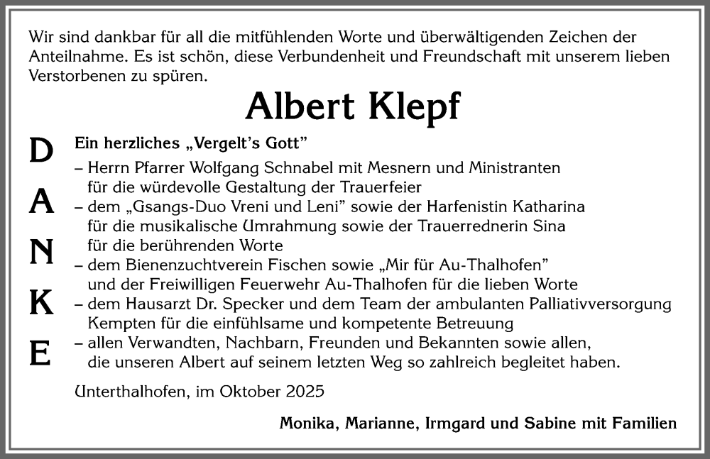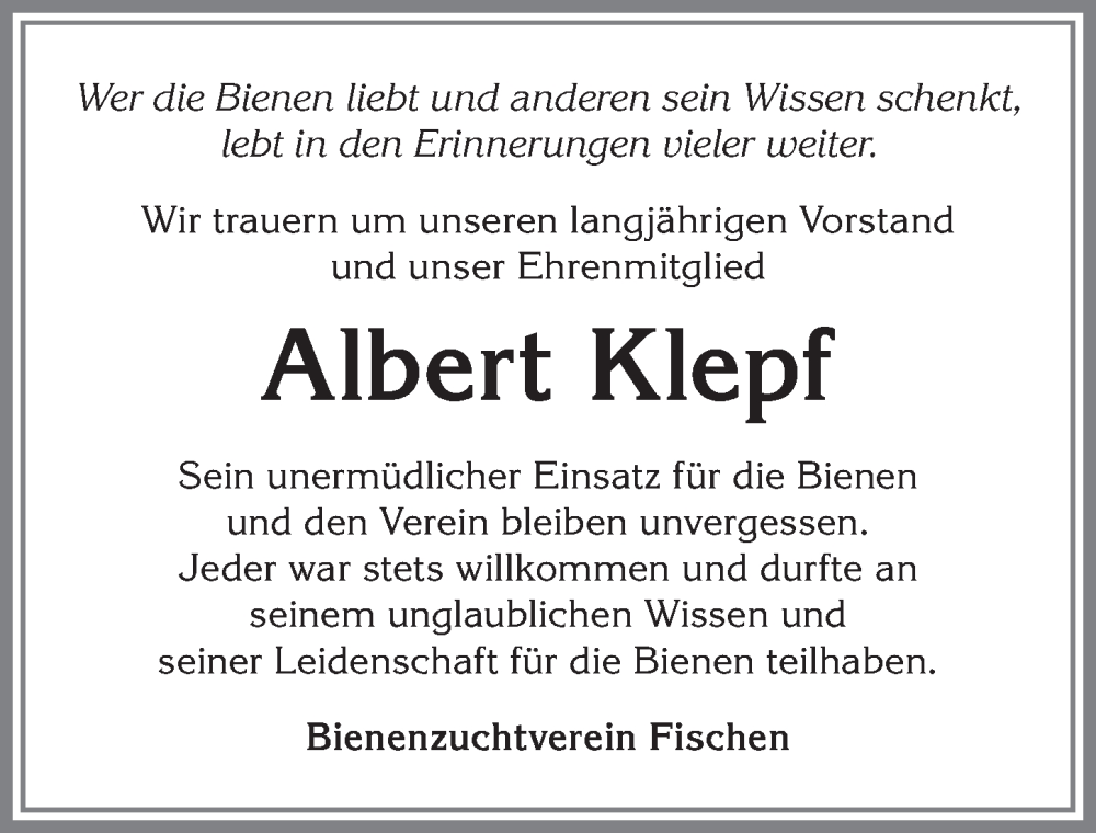 Hier finden Sie alle Traueranzeigen aus der Zeitung, die bisher für Albert Klepf erschienen sind. Weitere Traueranzeigen, die in der Zeitung erscheinen, werden hier ebenfalls aufgelistet