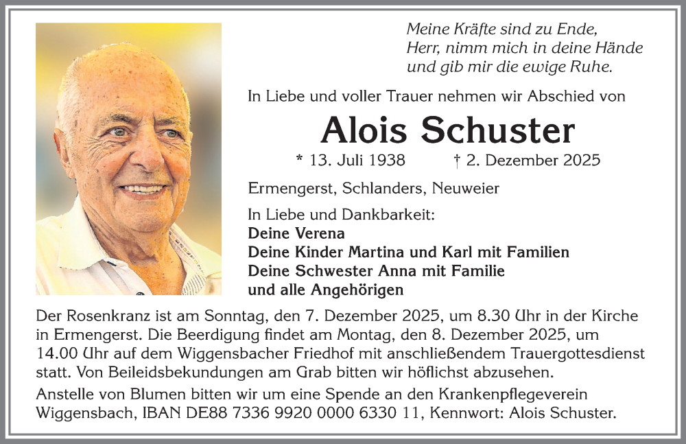 Hier finden Sie alle Traueranzeigen aus der Zeitung, die bisher für Alois Schuster erschienen sind. Weitere Traueranzeigen, die in der Zeitung erscheinen, werden hier ebenfalls aufgelistet