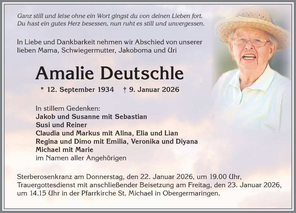 Hier finden Sie alle Traueranzeigen aus der Zeitung, die bisher für Amalie Deutschle erschienen sind. Weitere Traueranzeigen, die in der Zeitung erscheinen, werden hier ebenfalls aufgelistet