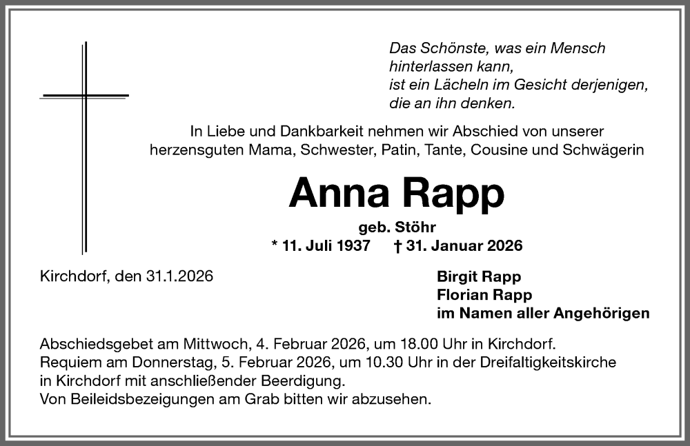 Hier finden Sie alle Traueranzeigen aus der Zeitung, die bisher für Anna Rapp erschienen sind. Weitere Traueranzeigen, die in der Zeitung erscheinen, werden hier ebenfalls aufgelistet