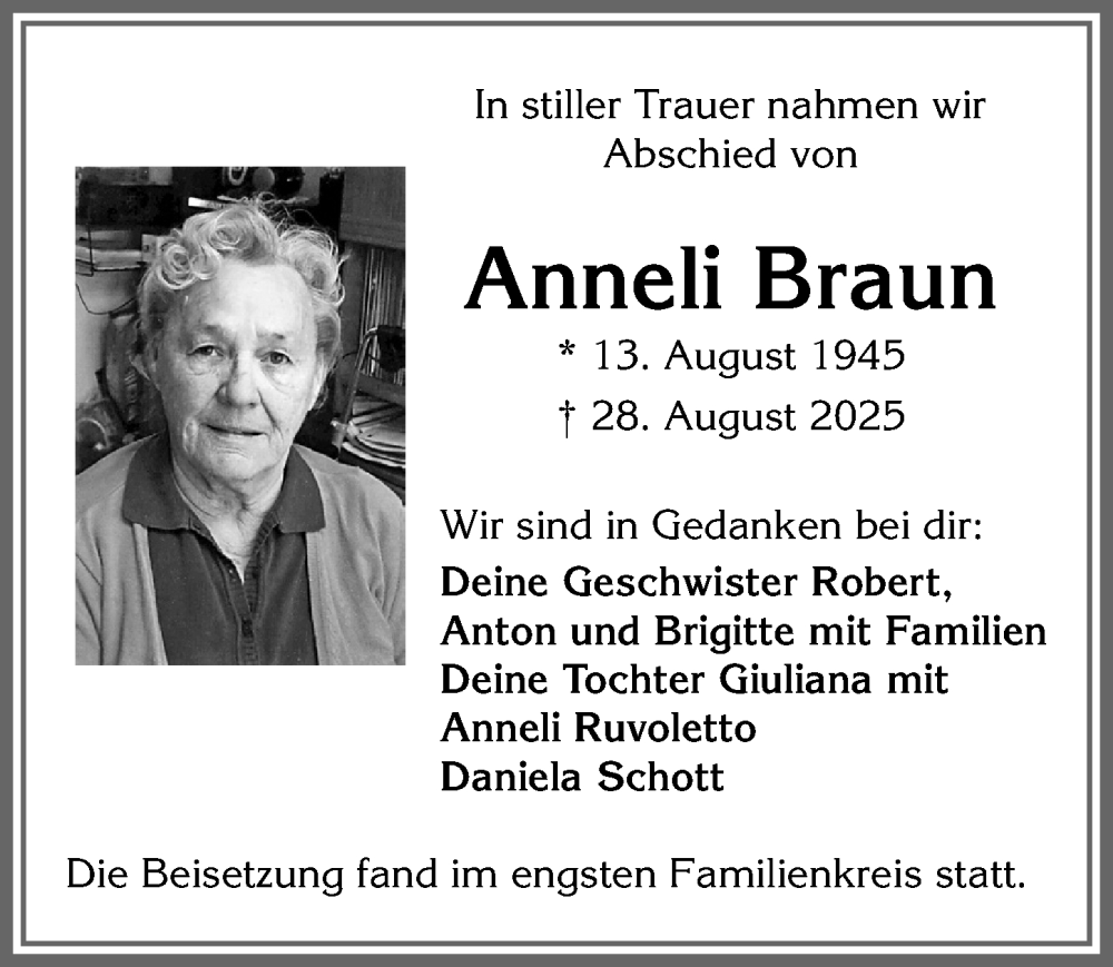 Hier finden Sie alle Traueranzeigen aus der Zeitung, die bisher für Anneli Braun erschienen sind. Weitere Traueranzeigen, die in der Zeitung erscheinen, werden hier ebenfalls aufgelistet