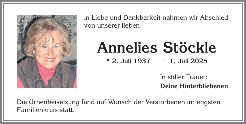 Hier finden Sie alle Traueranzeigen aus der Zeitung, die bisher für Annelies Stöckle erschienen sind. Weitere Traueranzeigen, die in der Zeitung erscheinen, werden hier ebenfalls aufgelistet