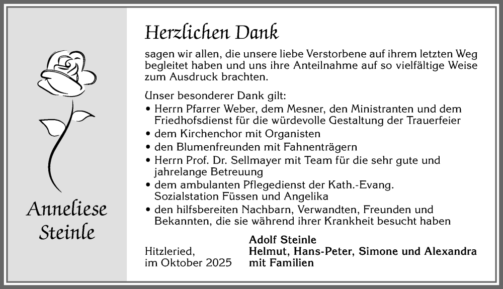 Hier finden Sie alle Traueranzeigen aus der Zeitung, die bisher für Anneliese Steinle erschienen sind. Weitere Traueranzeigen, die in der Zeitung erscheinen, werden hier ebenfalls aufgelistet