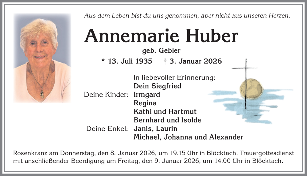 Hier finden Sie alle Traueranzeigen aus der Zeitung, die bisher für Annemarie Huber erschienen sind. Weitere Traueranzeigen, die in der Zeitung erscheinen, werden hier ebenfalls aufgelistet