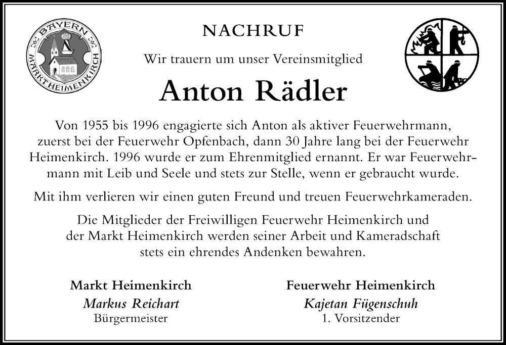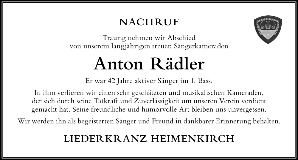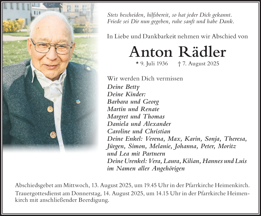 Hier finden Sie alle Traueranzeigen aus der Zeitung, die bisher für Anton Rädler erschienen sind. Weitere Traueranzeigen, die in der Zeitung erscheinen, werden hier ebenfalls aufgelistet