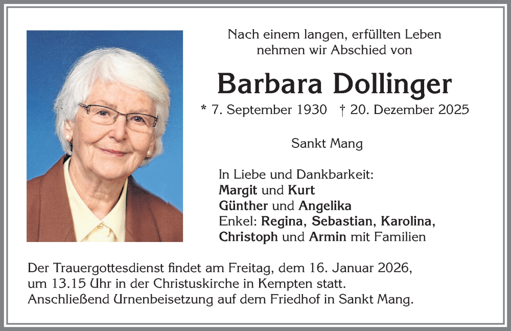 Hier finden Sie alle Traueranzeigen aus der Zeitung, die bisher für Barbara Dollinger erschienen sind. Weitere Traueranzeigen, die in der Zeitung erscheinen, werden hier ebenfalls aufgelistet