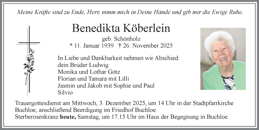 Hier finden Sie alle Traueranzeigen aus der Zeitung, die bisher für Benedikta Köberlein erschienen sind. Weitere Traueranzeigen, die in der Zeitung erscheinen, werden hier ebenfalls aufgelistet