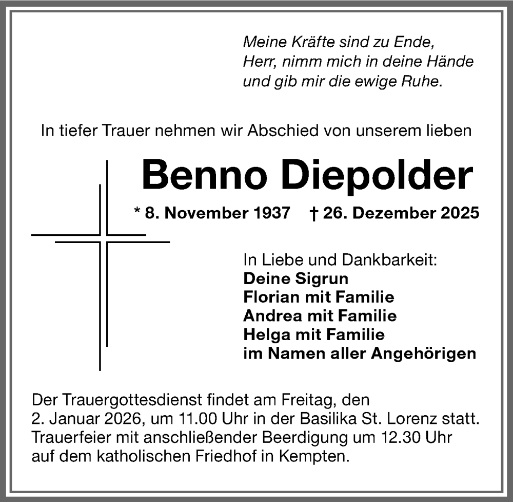 Hier finden Sie alle Traueranzeigen aus der Zeitung, die bisher für Benno Diepolder erschienen sind. Weitere Traueranzeigen, die in der Zeitung erscheinen, werden hier ebenfalls aufgelistet