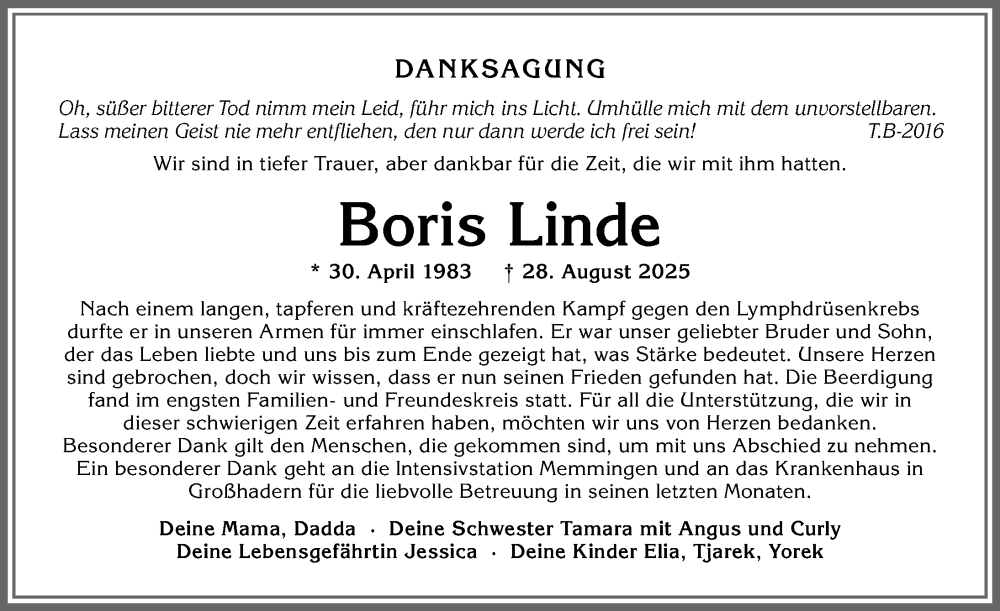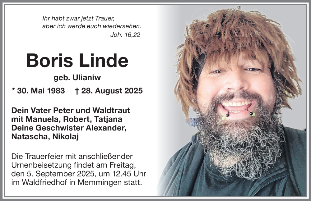 Hier finden Sie alle Traueranzeigen aus der Zeitung, die bisher für Boris Linde erschienen sind. Weitere Traueranzeigen, die in der Zeitung erscheinen, werden hier ebenfalls aufgelistet