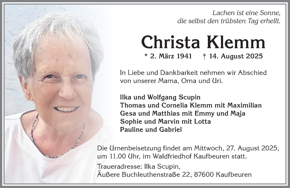 Hier finden Sie alle Traueranzeigen aus der Zeitung, die bisher für Christa Klemm erschienen sind. Weitere Traueranzeigen, die in der Zeitung erscheinen, werden hier ebenfalls aufgelistet