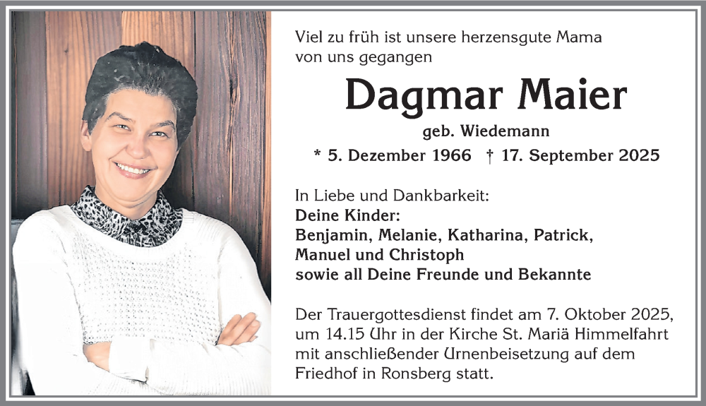 Hier finden Sie alle Traueranzeigen aus der Zeitung, die bisher für Dagmar Maier erschienen sind. Weitere Traueranzeigen, die in der Zeitung erscheinen, werden hier ebenfalls aufgelistet