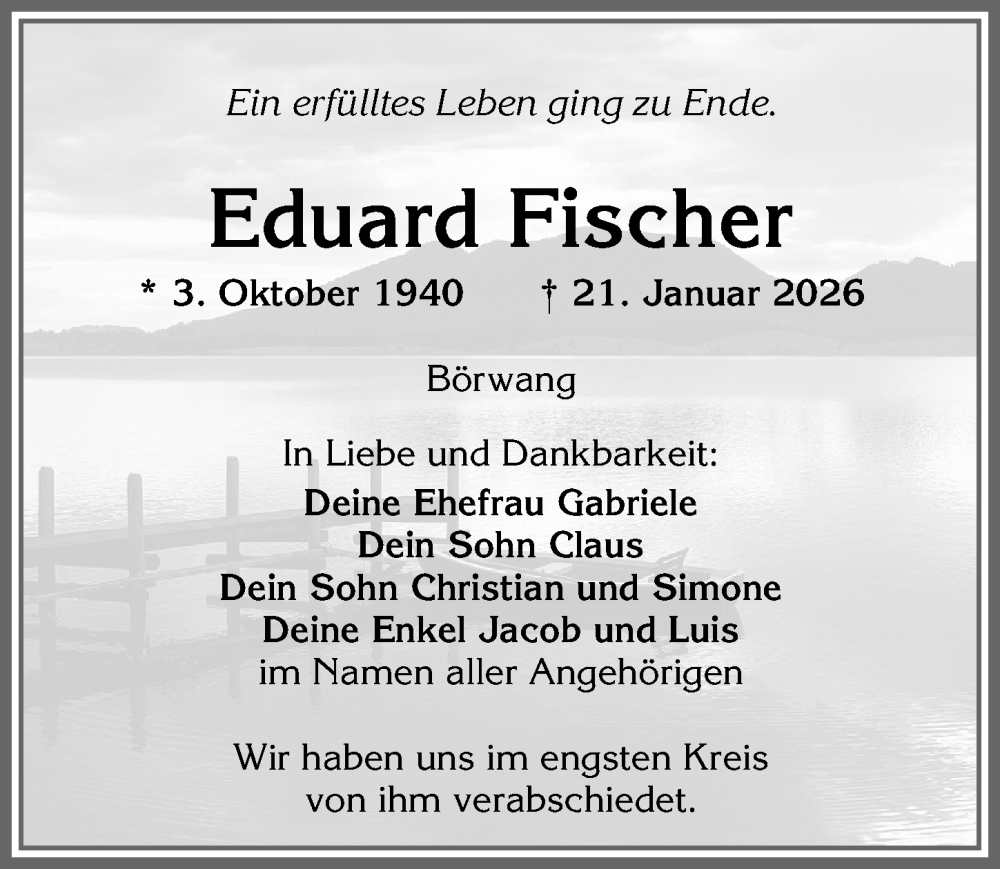 Hier finden Sie alle Traueranzeigen aus der Zeitung, die bisher für Eduard Fischer erschienen sind. Weitere Traueranzeigen, die in der Zeitung erscheinen, werden hier ebenfalls aufgelistet