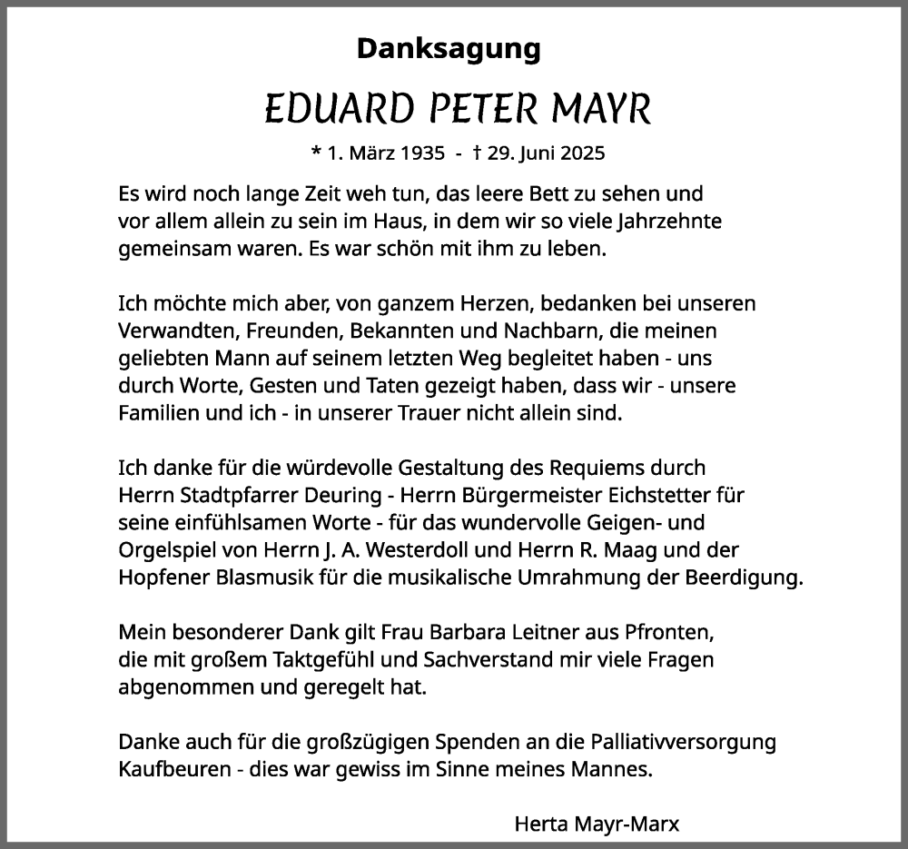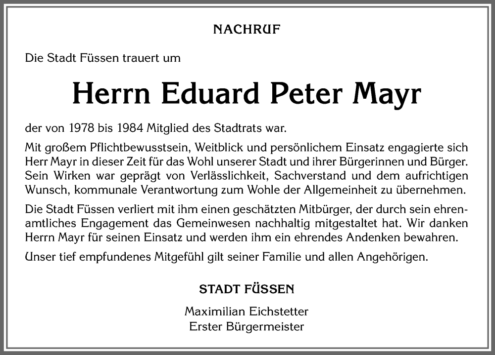 Hier finden Sie alle Traueranzeigen aus der Zeitung, die bisher für Eduard Peter Mayr erschienen sind. Weitere Traueranzeigen, die in der Zeitung erscheinen, werden hier ebenfalls aufgelistet