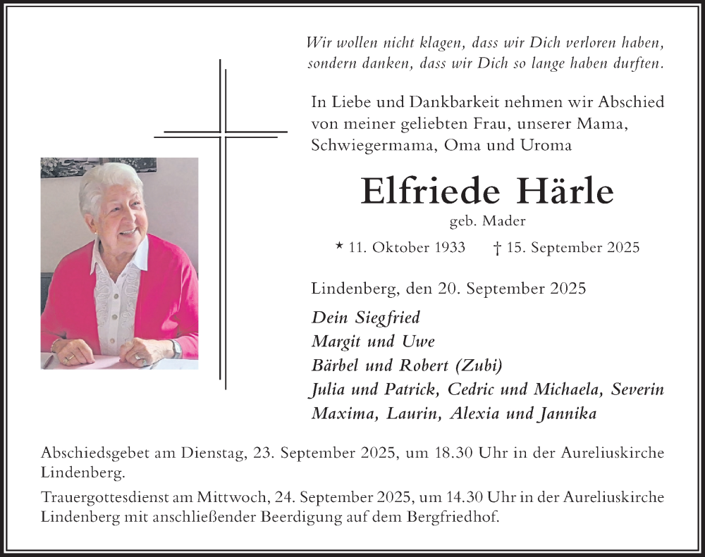Hier finden Sie alle Traueranzeigen aus der Zeitung, die bisher für Elfriede Härle erschienen sind. Weitere Traueranzeigen, die in der Zeitung erscheinen, werden hier ebenfalls aufgelistet