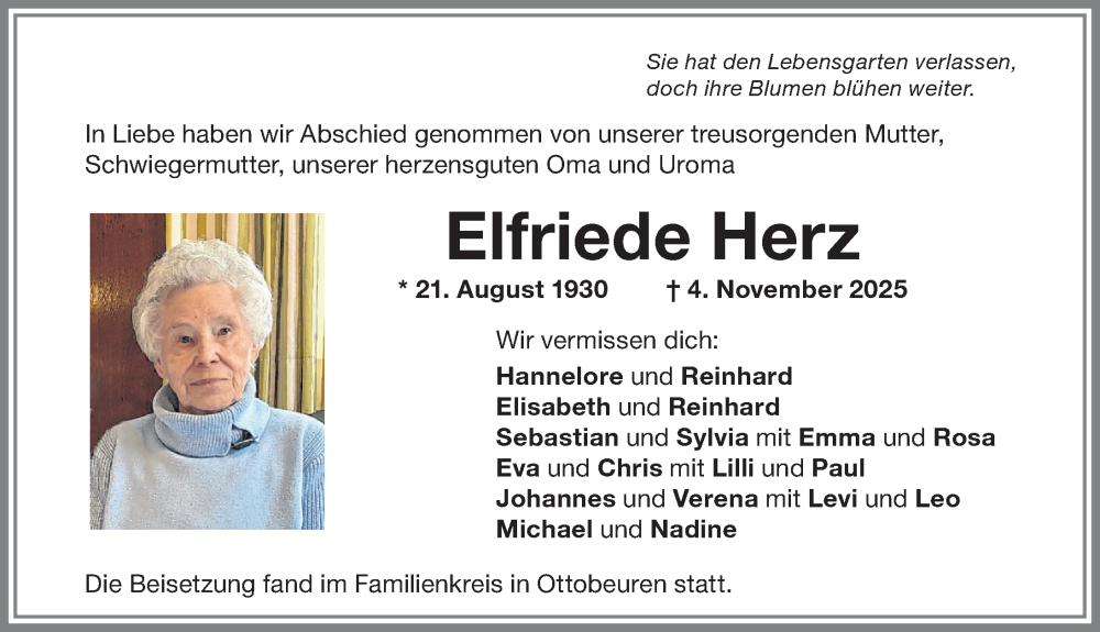 Hier finden Sie alle Traueranzeigen aus der Zeitung, die bisher für Elfriede Herz erschienen sind. Weitere Traueranzeigen, die in der Zeitung erscheinen, werden hier ebenfalls aufgelistet