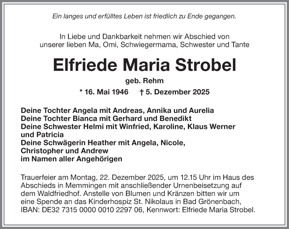 Hier finden Sie alle Traueranzeigen aus der Zeitung, die bisher für Elfriede Maria Strobel erschienen sind. Weitere Traueranzeigen, die in der Zeitung erscheinen, werden hier ebenfalls aufgelistet