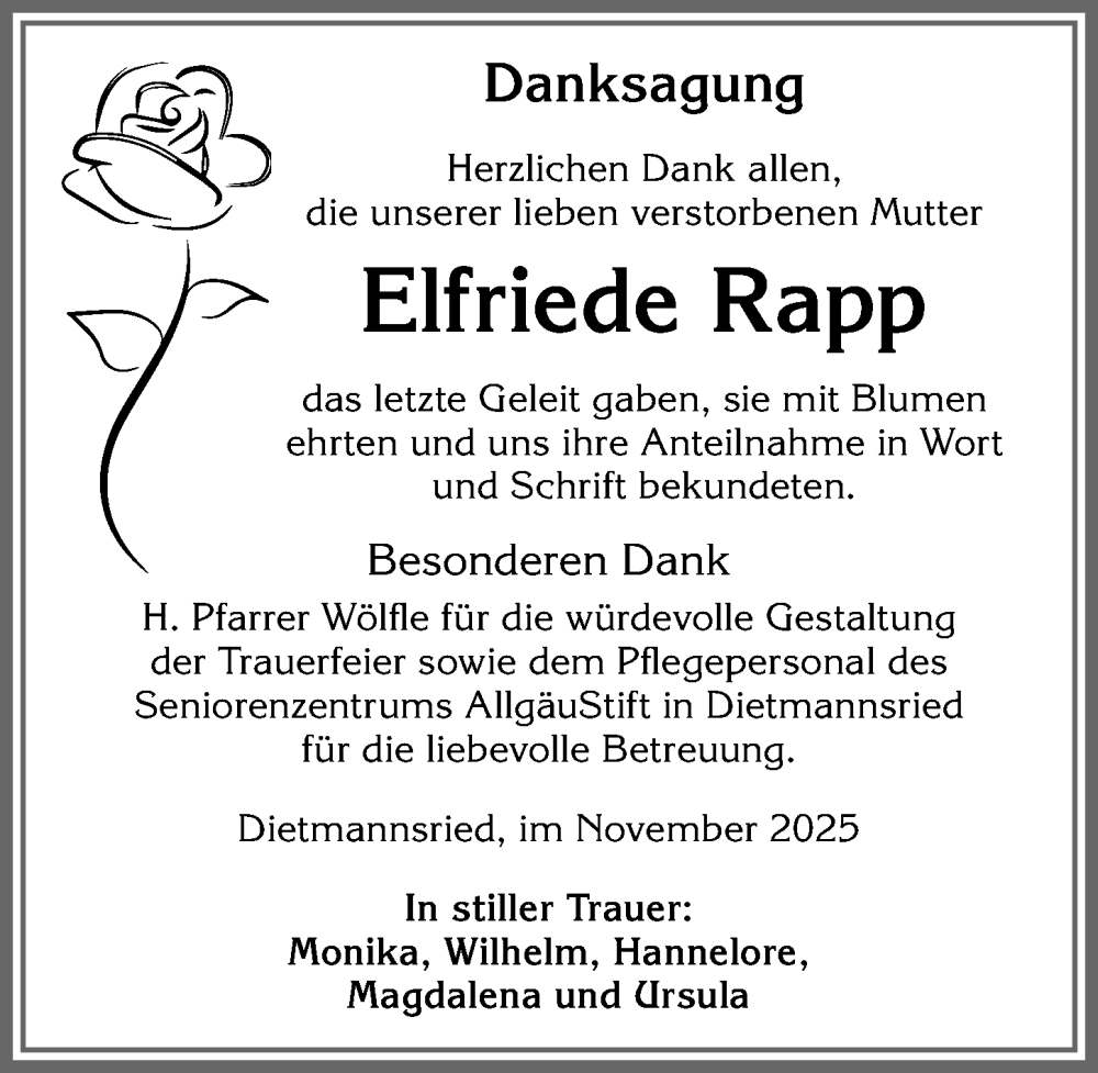 Hier finden Sie alle Traueranzeigen aus der Zeitung, die bisher für Elfriede Rapp erschienen sind. Weitere Traueranzeigen, die in der Zeitung erscheinen, werden hier ebenfalls aufgelistet