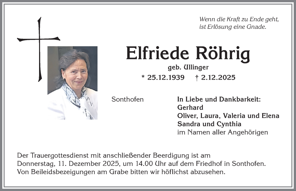 Hier finden Sie alle Traueranzeigen aus der Zeitung, die bisher für Elfriede Röhrig erschienen sind. Weitere Traueranzeigen, die in der Zeitung erscheinen, werden hier ebenfalls aufgelistet