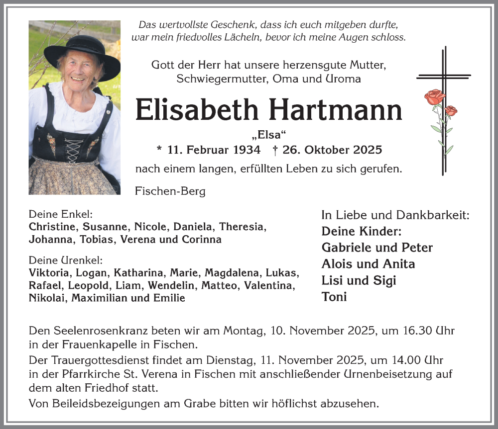 Hier finden Sie alle Traueranzeigen aus der Zeitung, die bisher für Elisabeth Hartmann erschienen sind. Weitere Traueranzeigen, die in der Zeitung erscheinen, werden hier ebenfalls aufgelistet
