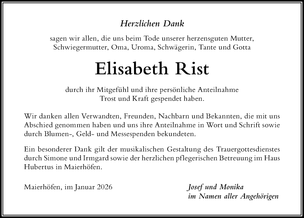 Hier finden Sie alle Traueranzeigen aus der Zeitung, die bisher für Elisabeth Rist erschienen sind. Weitere Traueranzeigen, die in der Zeitung erscheinen, werden hier ebenfalls aufgelistet