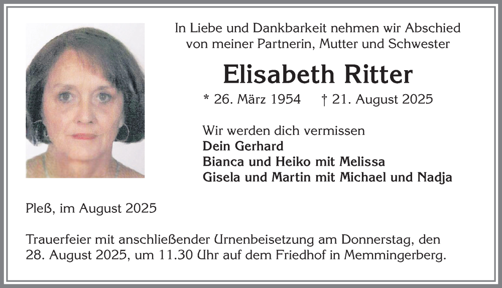 Hier finden Sie alle Traueranzeigen aus der Zeitung, die bisher für Elisabeth Ritter erschienen sind. Weitere Traueranzeigen, die in der Zeitung erscheinen, werden hier ebenfalls aufgelistet
