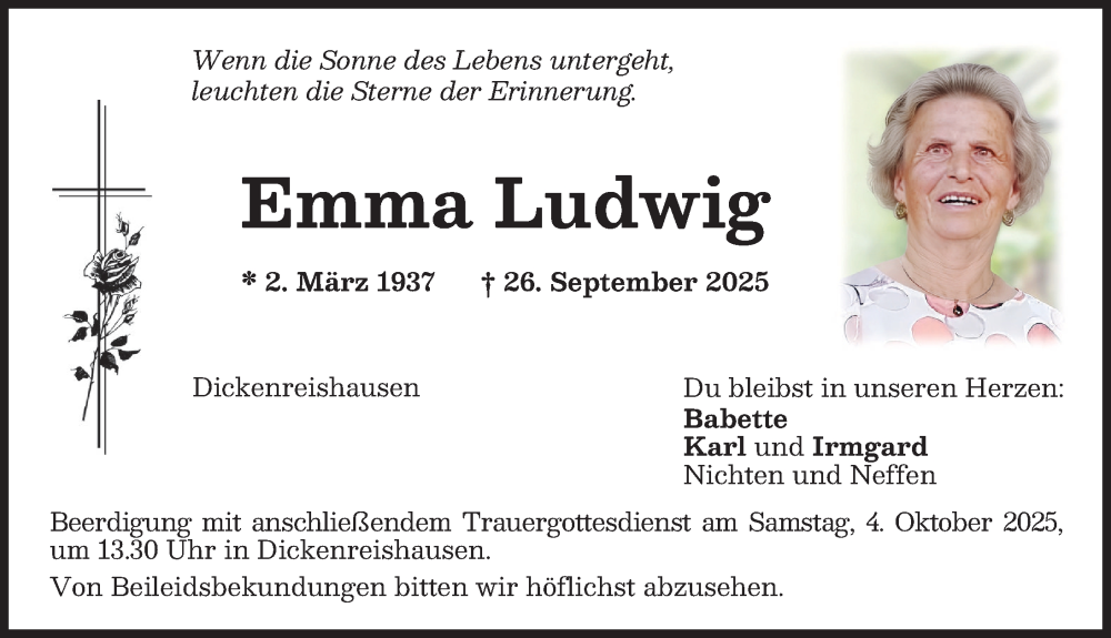 Hier finden Sie alle Traueranzeigen aus der Zeitung, die bisher für Emma Ludwig erschienen sind. Weitere Traueranzeigen, die in der Zeitung erscheinen, werden hier ebenfalls aufgelistet