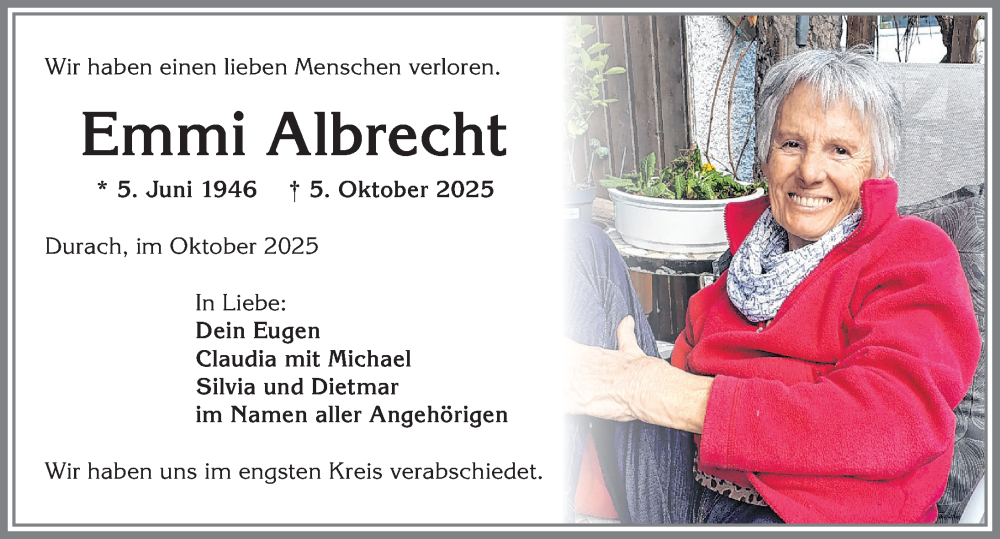 Hier finden Sie alle Traueranzeigen aus der Zeitung, die bisher für Emmi Albrecht erschienen sind. Weitere Traueranzeigen, die in der Zeitung erscheinen, werden hier ebenfalls aufgelistet