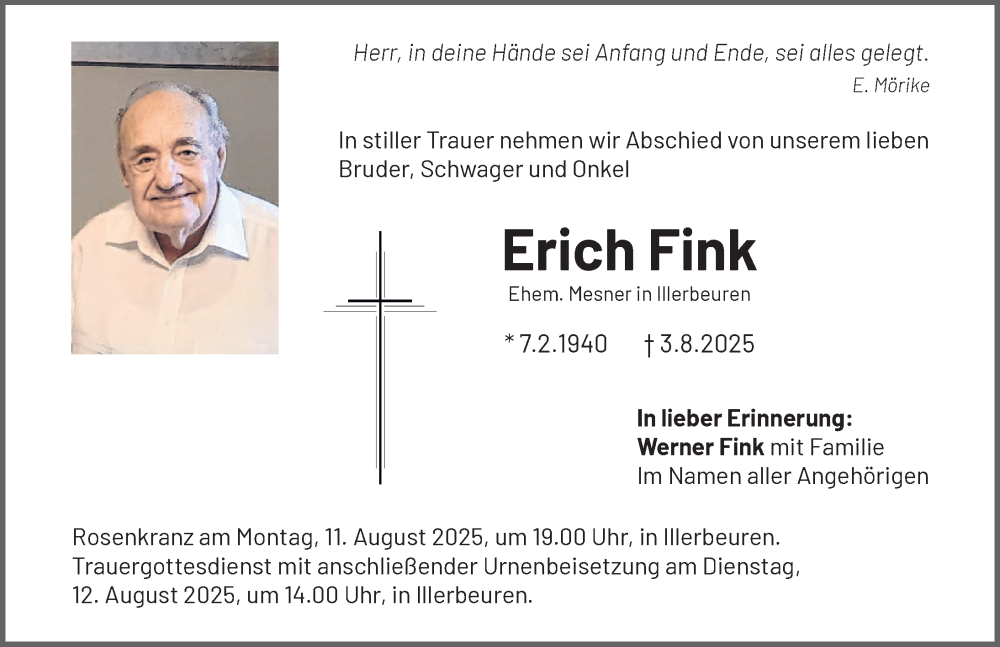 Hier finden Sie alle Traueranzeigen aus der Zeitung, die bisher für Erich Fink erschienen sind. Weitere Traueranzeigen, die in der Zeitung erscheinen, werden hier ebenfalls aufgelistet