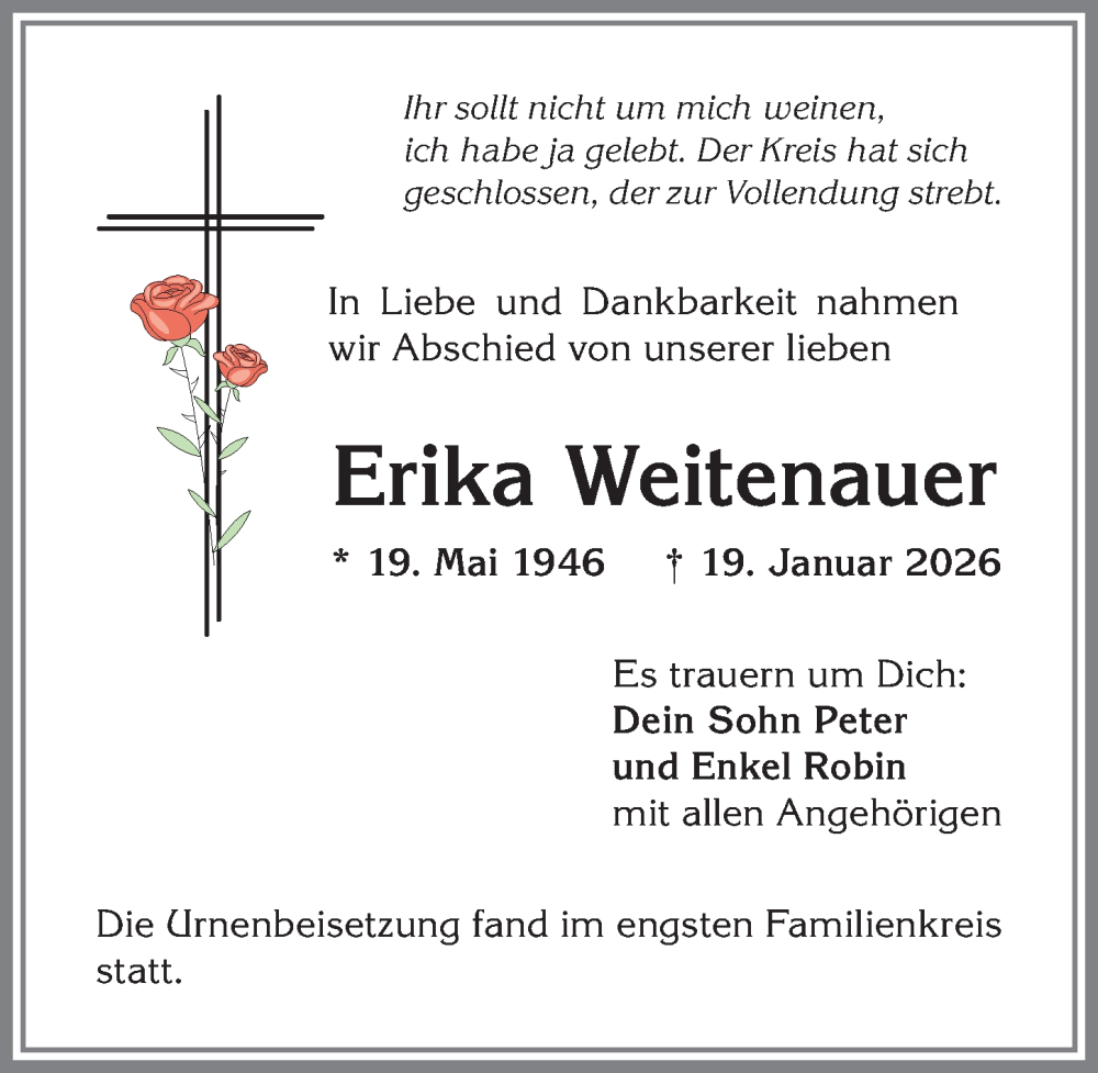 Hier finden Sie alle Traueranzeigen aus der Zeitung, die bisher für Erika Weitenauer erschienen sind. Weitere Traueranzeigen, die in der Zeitung erscheinen, werden hier ebenfalls aufgelistet