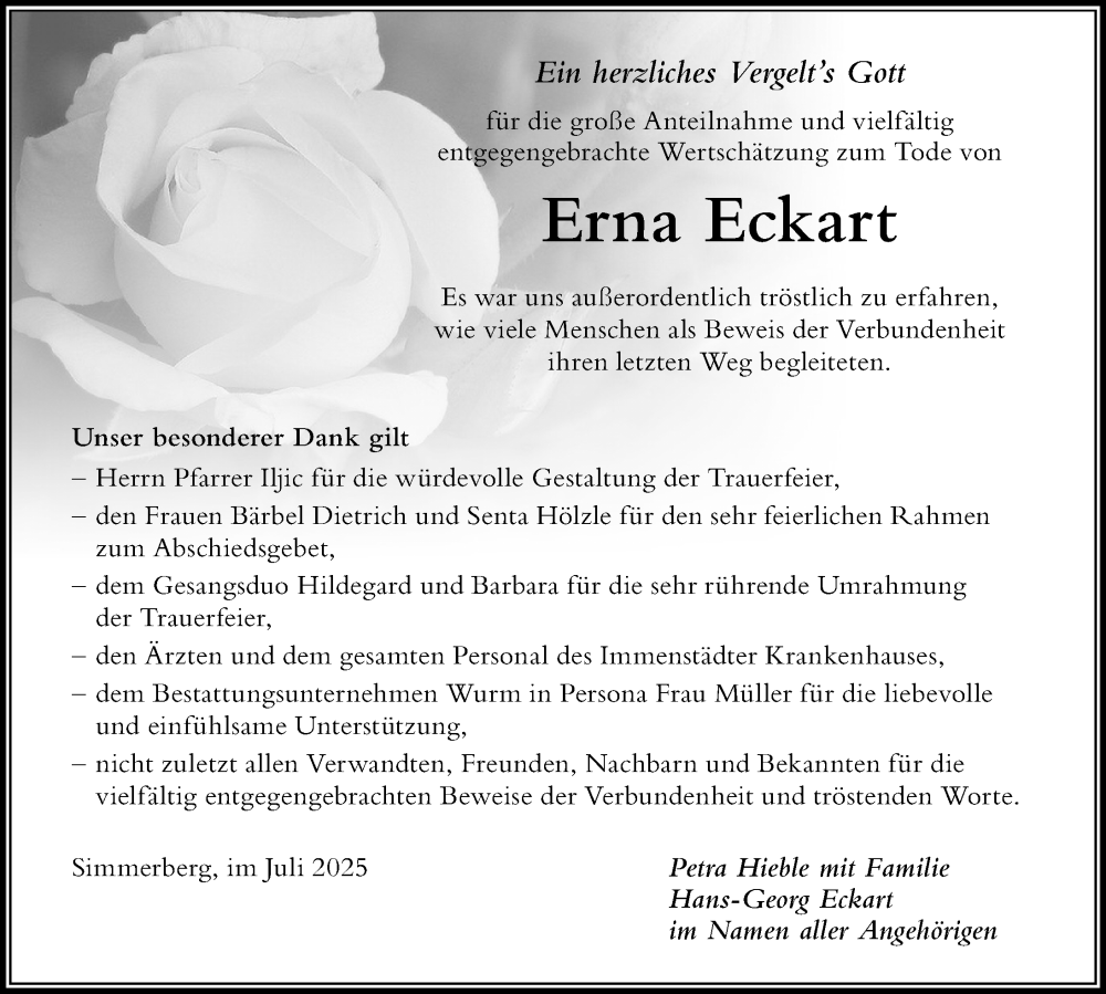 Hier finden Sie alle Traueranzeigen aus der Zeitung, die bisher für Erna Eckart erschienen sind. Weitere Traueranzeigen, die in der Zeitung erscheinen, werden hier ebenfalls aufgelistet