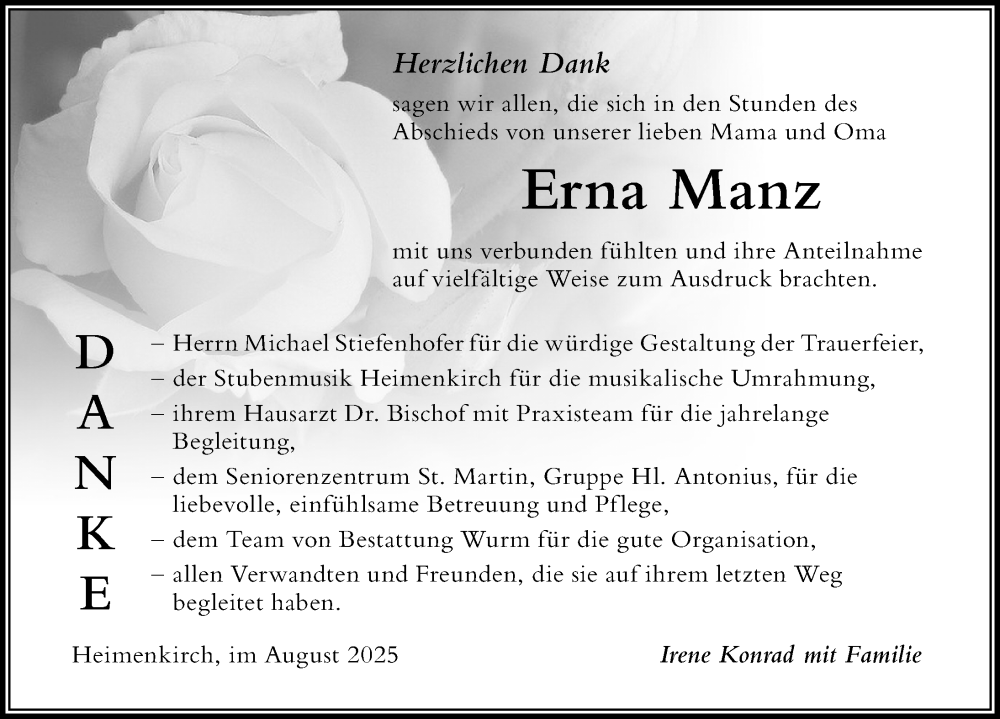 Hier finden Sie alle Traueranzeigen aus der Zeitung, die bisher für Erna Manz erschienen sind. Weitere Traueranzeigen, die in der Zeitung erscheinen, werden hier ebenfalls aufgelistet