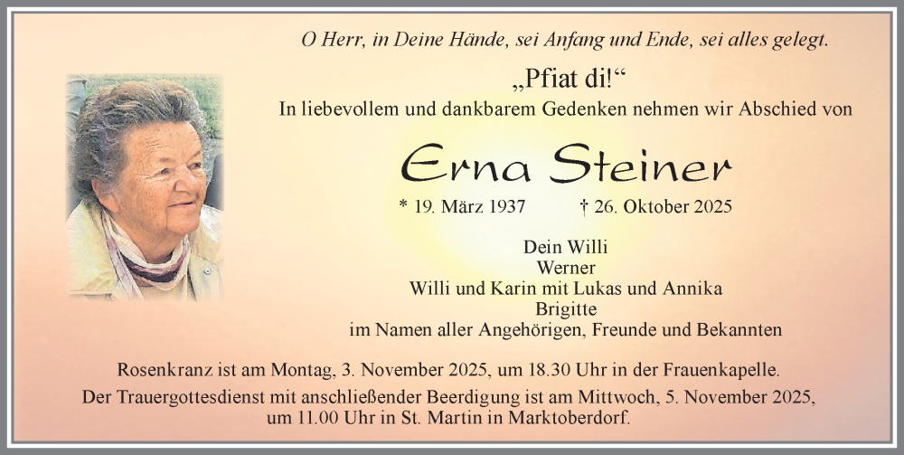 Hier finden Sie alle Traueranzeigen aus der Zeitung, die bisher für Erna Steiner erschienen sind. Weitere Traueranzeigen, die in der Zeitung erscheinen, werden hier ebenfalls aufgelistet