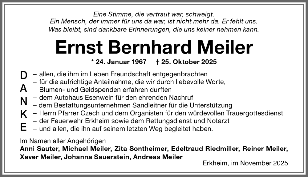 Hier finden Sie alle Traueranzeigen aus der Zeitung, die bisher für Ernst Bernhard Meiler erschienen sind. Weitere Traueranzeigen, die in der Zeitung erscheinen, werden hier ebenfalls aufgelistet