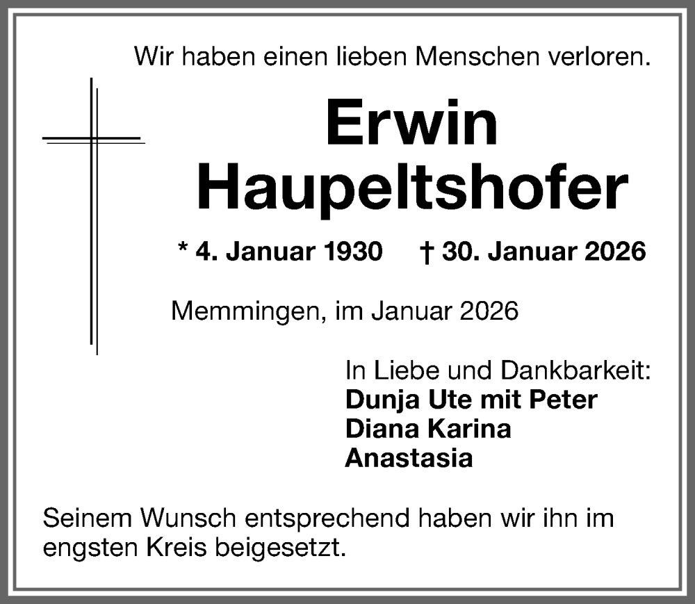 Hier finden Sie alle Traueranzeigen aus der Zeitung, die bisher für Erwin Haupeltshofer erschienen sind. Weitere Traueranzeigen, die in der Zeitung erscheinen, werden hier ebenfalls aufgelistet