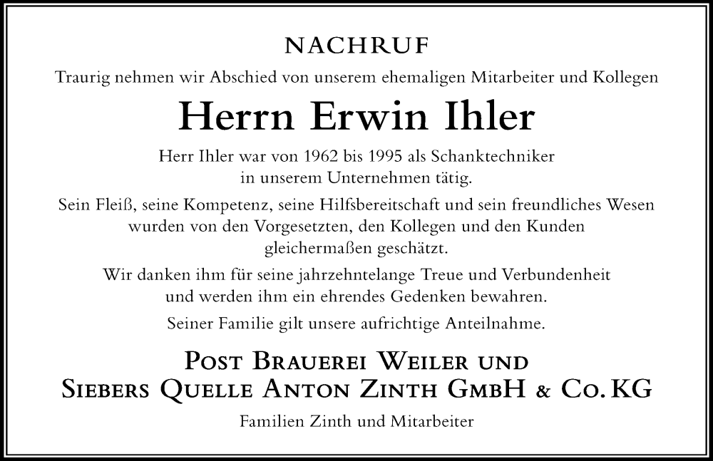 Hier finden Sie alle Traueranzeigen aus der Zeitung, die bisher für Erwin Ihler erschienen sind. Weitere Traueranzeigen, die in der Zeitung erscheinen, werden hier ebenfalls aufgelistet