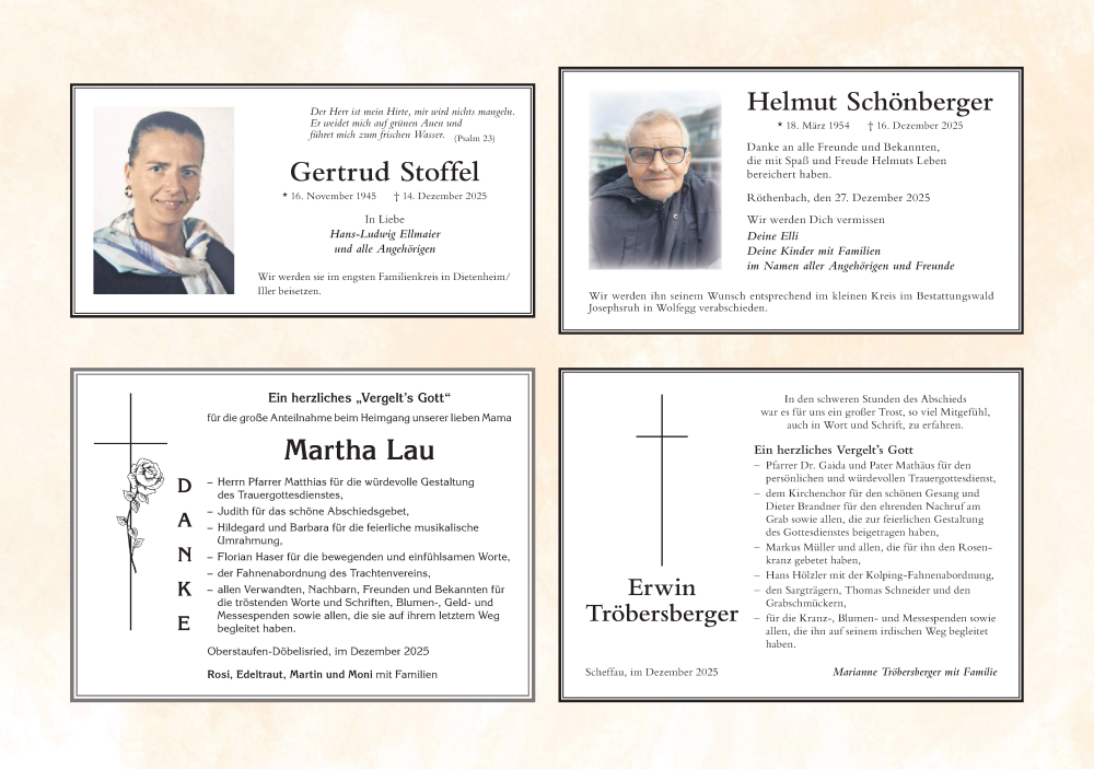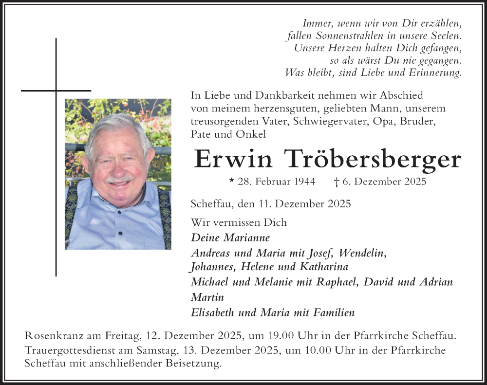 Hier finden Sie alle Traueranzeigen aus der Zeitung, die bisher für Erwin Tröbersberger erschienen sind. Weitere Traueranzeigen, die in der Zeitung erscheinen, werden hier ebenfalls aufgelistet