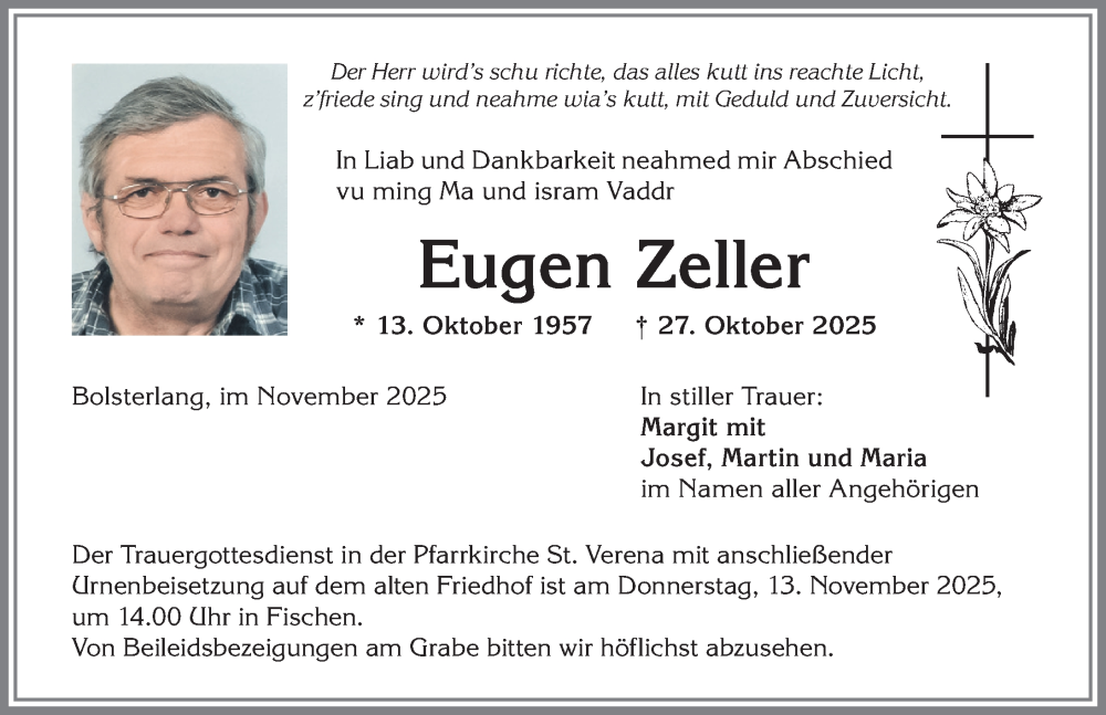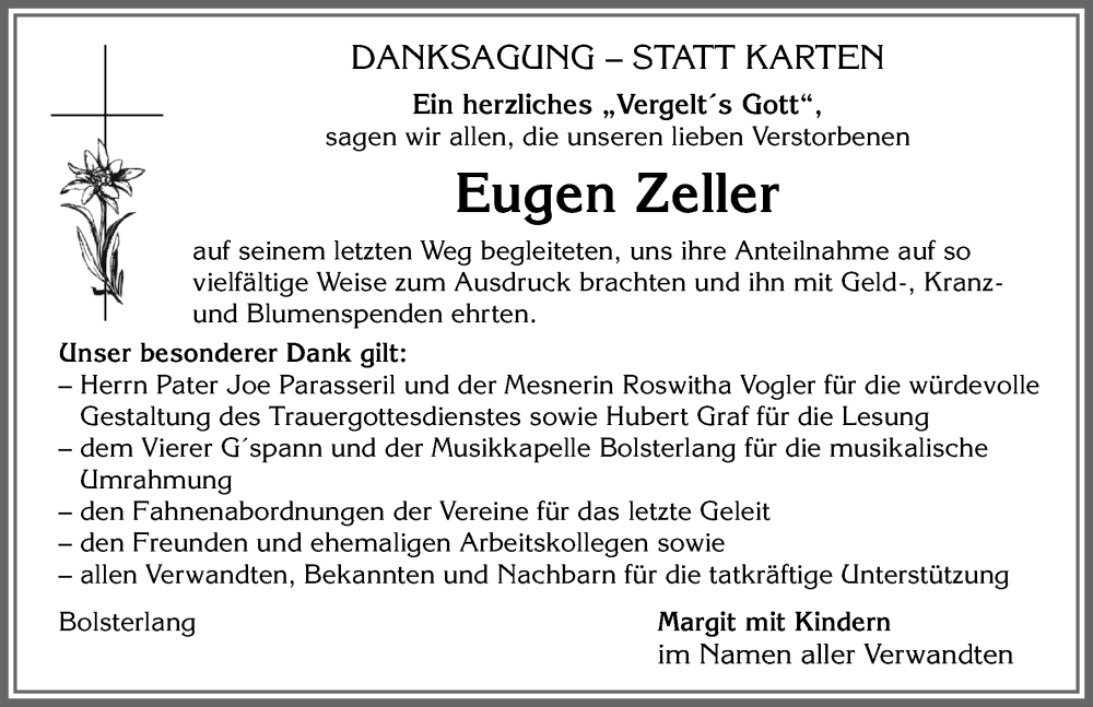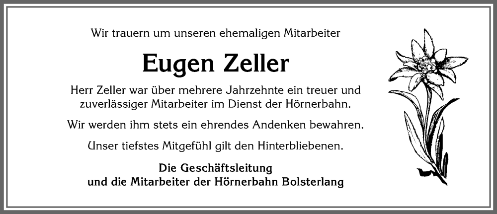 Hier finden Sie alle Traueranzeigen aus der Zeitung, die bisher für Eugen Zeller erschienen sind. Weitere Traueranzeigen, die in der Zeitung erscheinen, werden hier ebenfalls aufgelistet