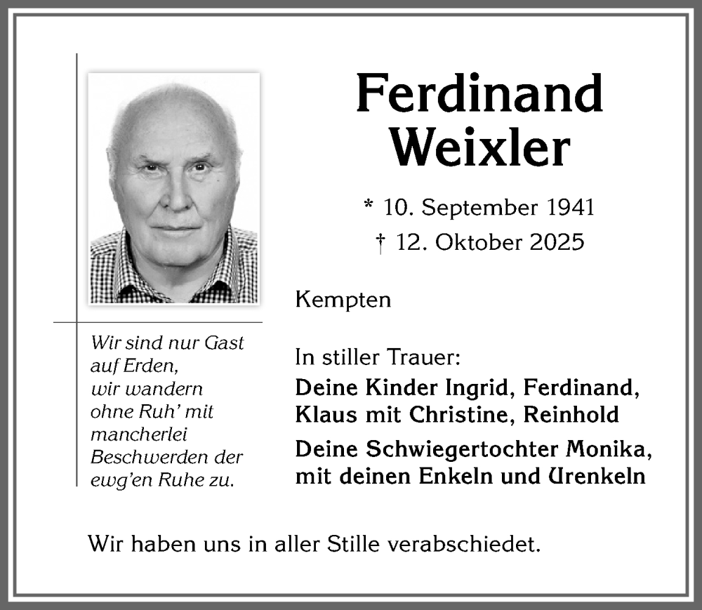 Hier finden Sie alle Traueranzeigen aus der Zeitung, die bisher für Ferdinand Weixler erschienen sind. Weitere Traueranzeigen, die in der Zeitung erscheinen, werden hier ebenfalls aufgelistet
