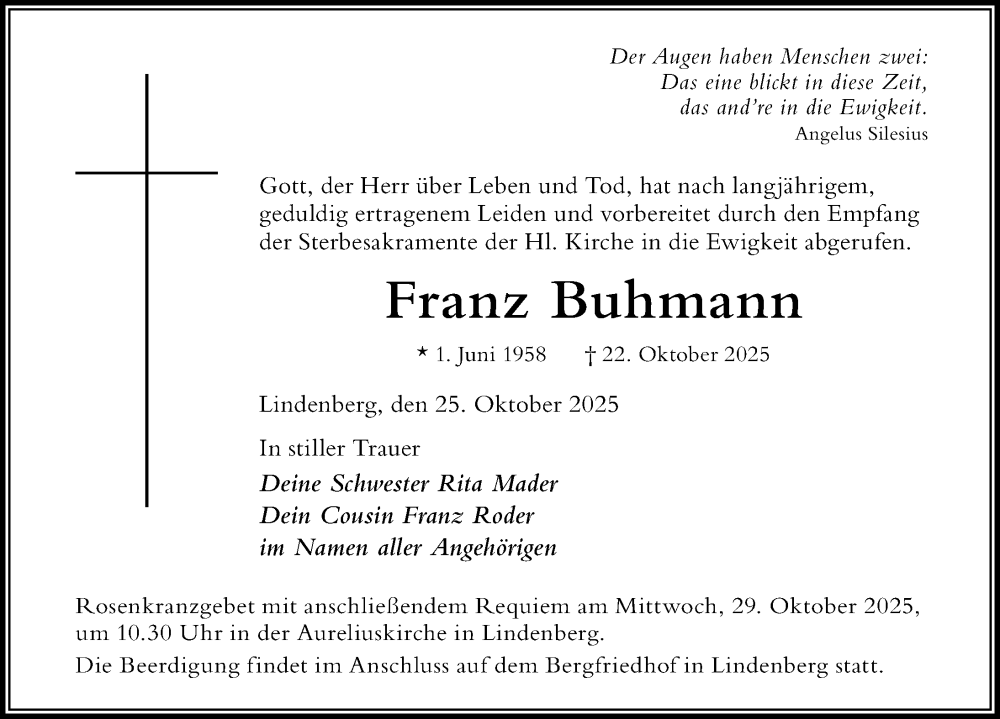 Hier finden Sie alle Traueranzeigen aus der Zeitung, die bisher für Franz Buhmann erschienen sind. Weitere Traueranzeigen, die in der Zeitung erscheinen, werden hier ebenfalls aufgelistet