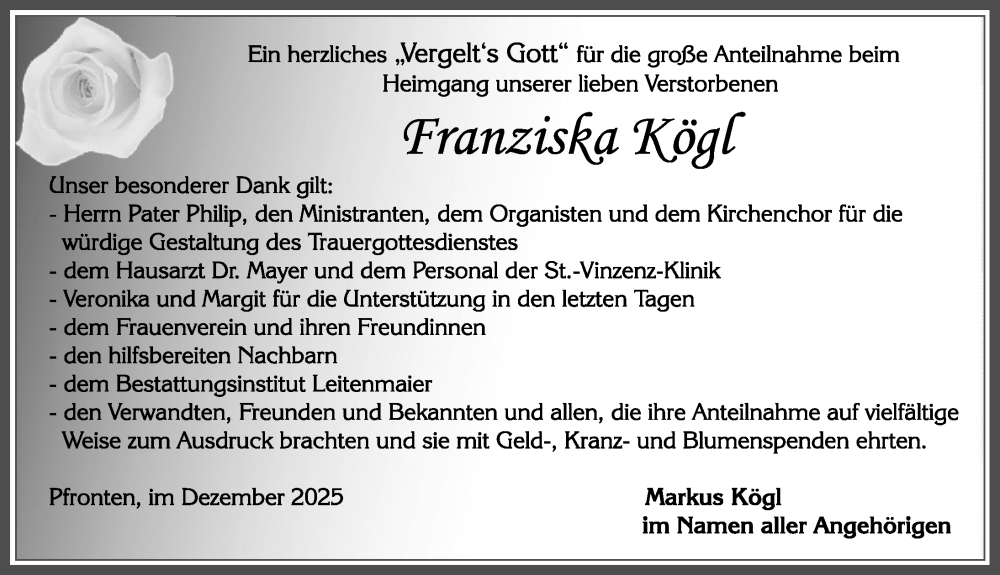 Hier finden Sie alle Traueranzeigen aus der Zeitung, die bisher für Franziska Kögl erschienen sind. Weitere Traueranzeigen, die in der Zeitung erscheinen, werden hier ebenfalls aufgelistet