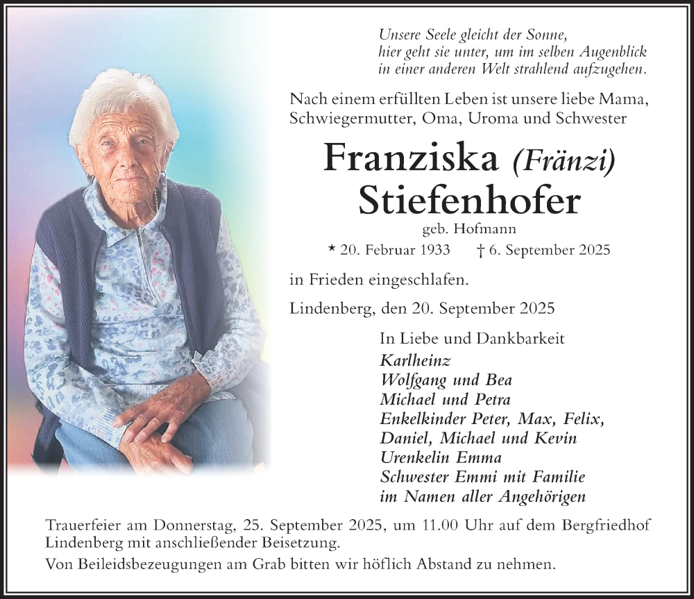 Hier finden Sie alle Traueranzeigen aus der Zeitung, die bisher für Franziska Stiefenhofer erschienen sind. Weitere Traueranzeigen, die in der Zeitung erscheinen, werden hier ebenfalls aufgelistet