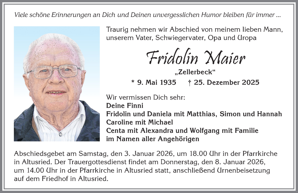 Hier finden Sie alle Traueranzeigen aus der Zeitung, die bisher für Fridolin Maier erschienen sind. Weitere Traueranzeigen, die in der Zeitung erscheinen, werden hier ebenfalls aufgelistet