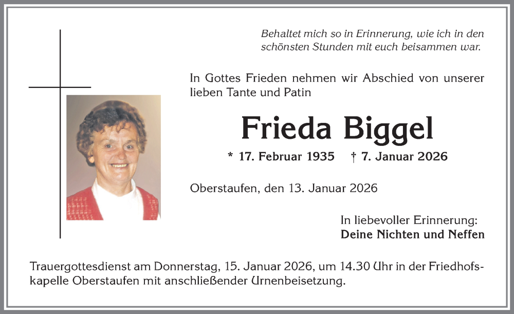 Hier finden Sie alle Traueranzeigen aus der Zeitung, die bisher für Frieda Biggel erschienen sind. Weitere Traueranzeigen, die in der Zeitung erscheinen, werden hier ebenfalls aufgelistet
