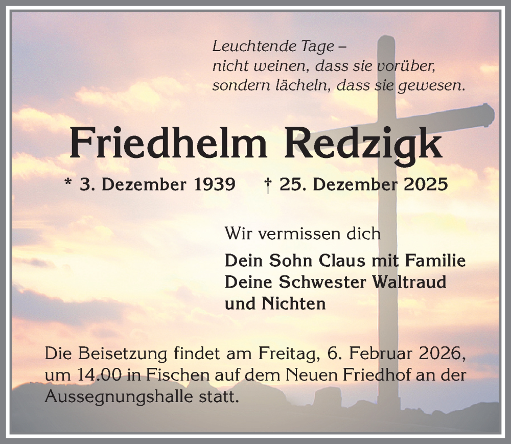 Hier finden Sie alle Traueranzeigen aus der Zeitung, die bisher für Friedhelm Redzigk erschienen sind. Weitere Traueranzeigen, die in der Zeitung erscheinen, werden hier ebenfalls aufgelistet