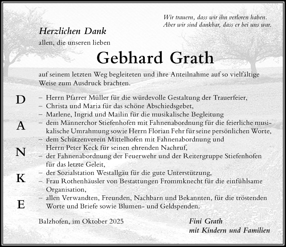 Hier finden Sie alle Traueranzeigen aus der Zeitung, die bisher für Gebhard Grath erschienen sind. Weitere Traueranzeigen, die in der Zeitung erscheinen, werden hier ebenfalls aufgelistet