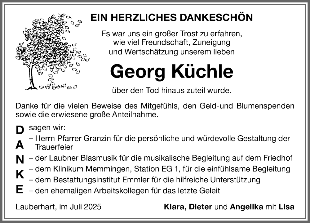 Hier finden Sie alle Traueranzeigen aus der Zeitung, die bisher für Georg Küchle erschienen sind. Weitere Traueranzeigen, die in der Zeitung erscheinen, werden hier ebenfalls aufgelistet