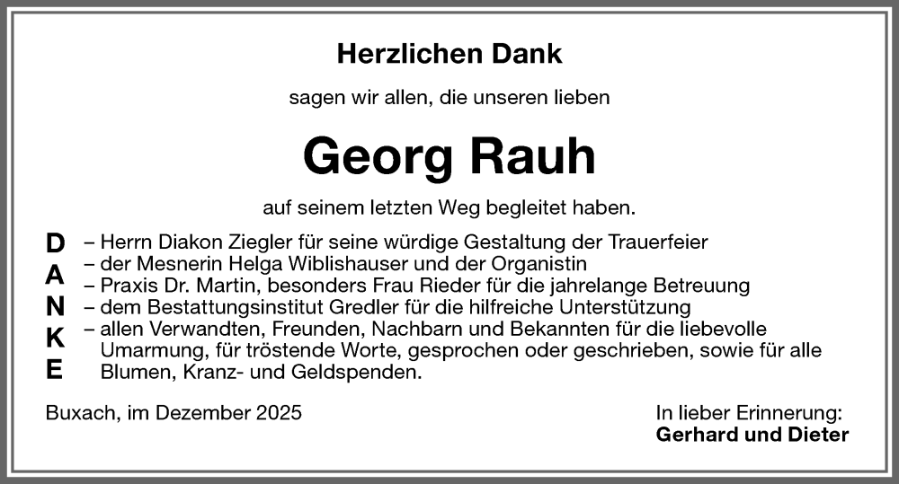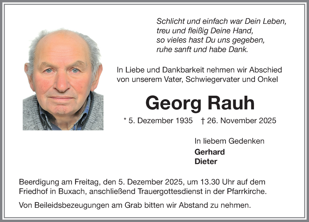 Hier finden Sie alle Traueranzeigen aus der Zeitung, die bisher für Georg Rauh erschienen sind. Weitere Traueranzeigen, die in der Zeitung erscheinen, werden hier ebenfalls aufgelistet