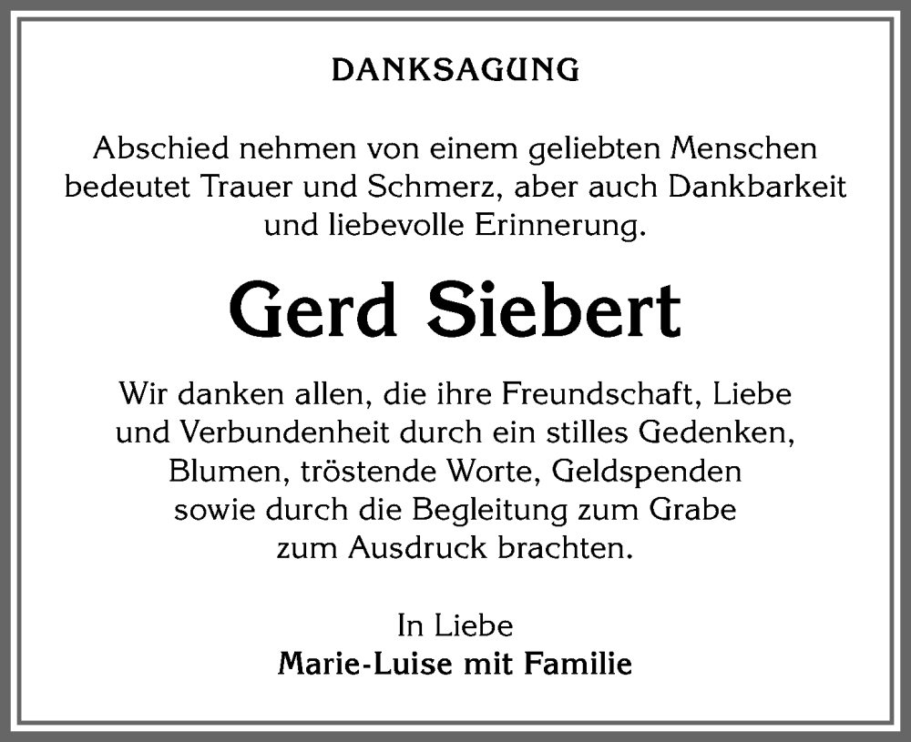 Hier finden Sie alle Traueranzeigen aus der Zeitung, die bisher für Gerd Siebert erschienen sind. Weitere Traueranzeigen, die in der Zeitung erscheinen, werden hier ebenfalls aufgelistet
