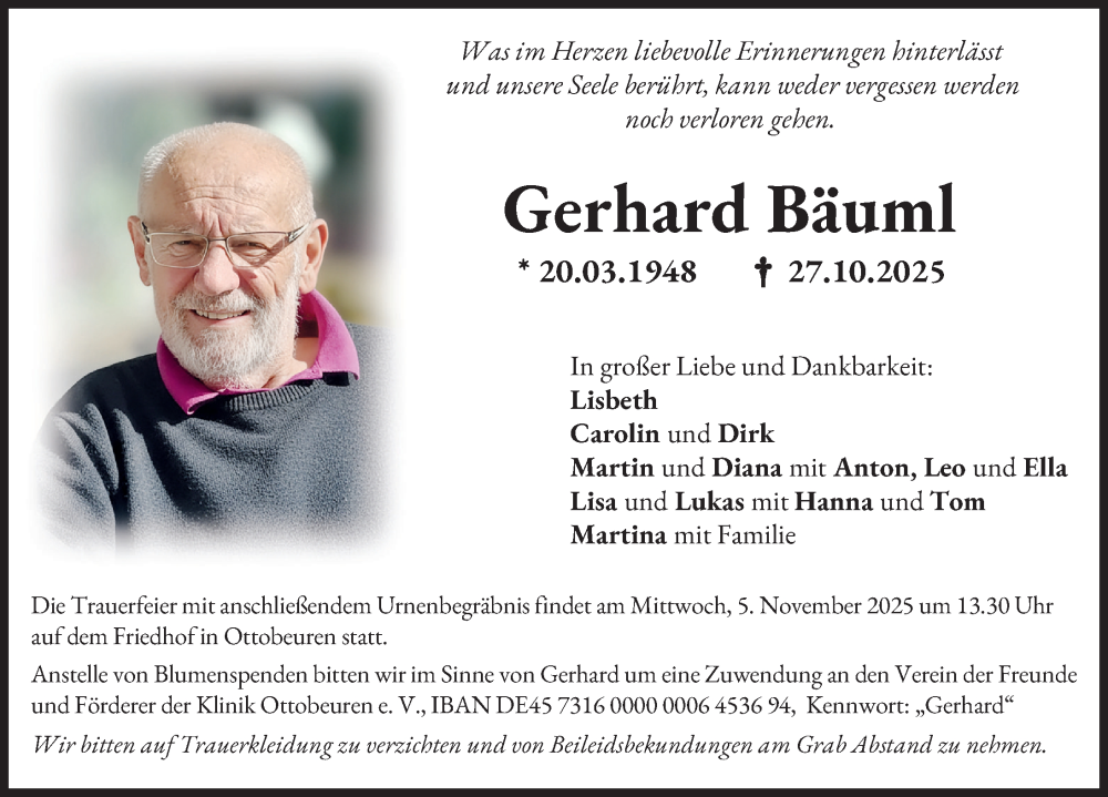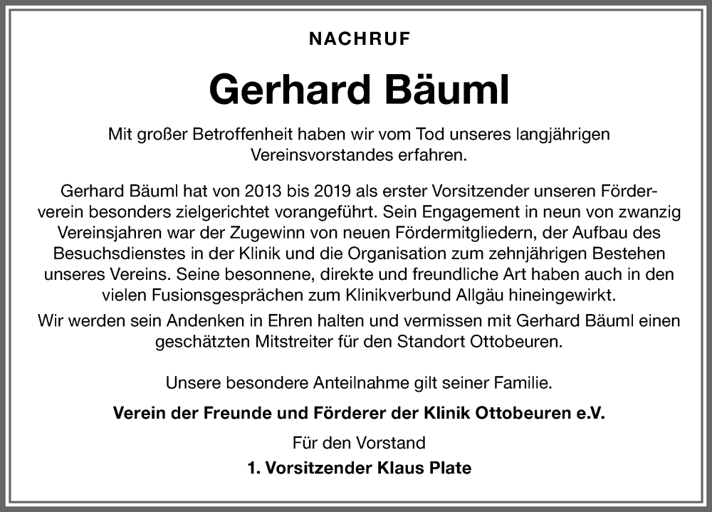 Hier finden Sie alle Traueranzeigen aus der Zeitung, die bisher für Gerhard Bäuml erschienen sind. Weitere Traueranzeigen, die in der Zeitung erscheinen, werden hier ebenfalls aufgelistet